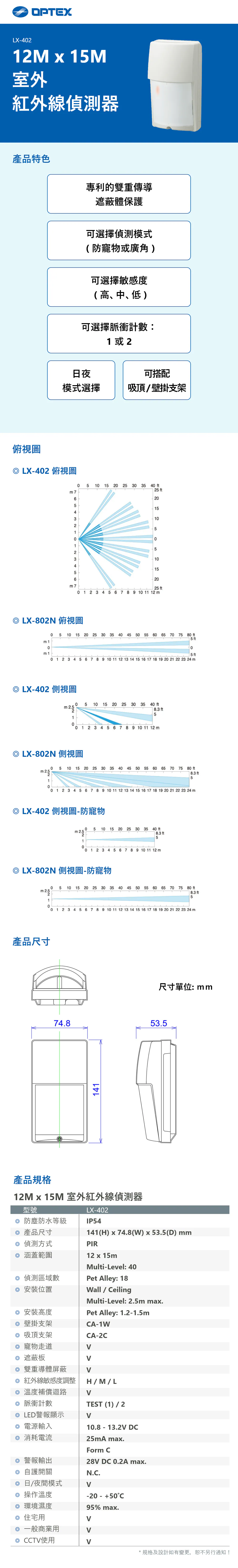 OPTEX LX-402 室外紅外線偵測器採用專利雙重傳導遮蔽體設計,提供 12M×15M 精準偵測範圍,並具備防寵物與廣角模式選擇。支援多段敏感度、脈衝計數與日夜模式切換,適合多種室外環境安裝與安全防護需求。